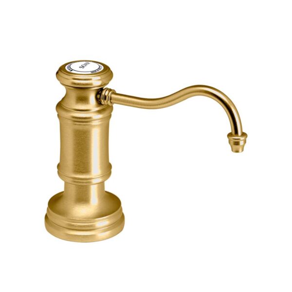 The Waterstone Traditional Soap/Lotion Dispenser – Extended Hook Spout eliminates unsightly soap bottles and complements your traditional kitchen faucets. Its 5″ extended spout is ideal for larger sinks, and the large-volume pump dispenses 2cc of liquid with each use. Made from solid brass with an anti-wick design, this dispenser is refillable from the top, eliminating drips and under-sink refills.
